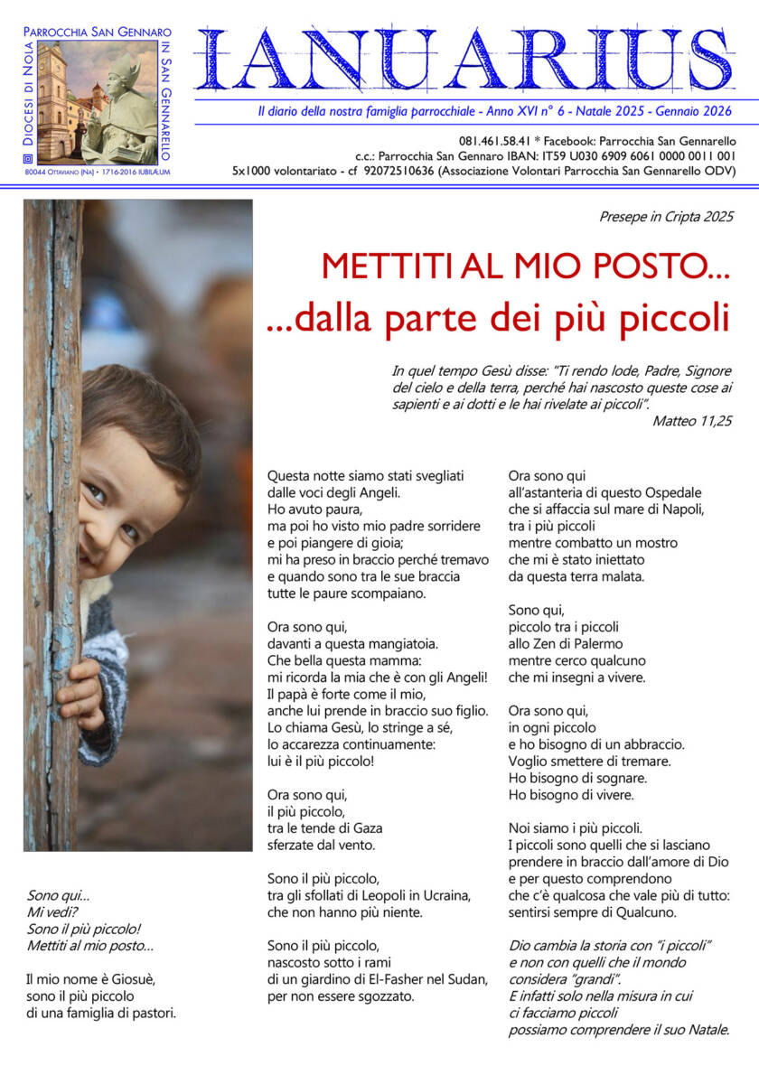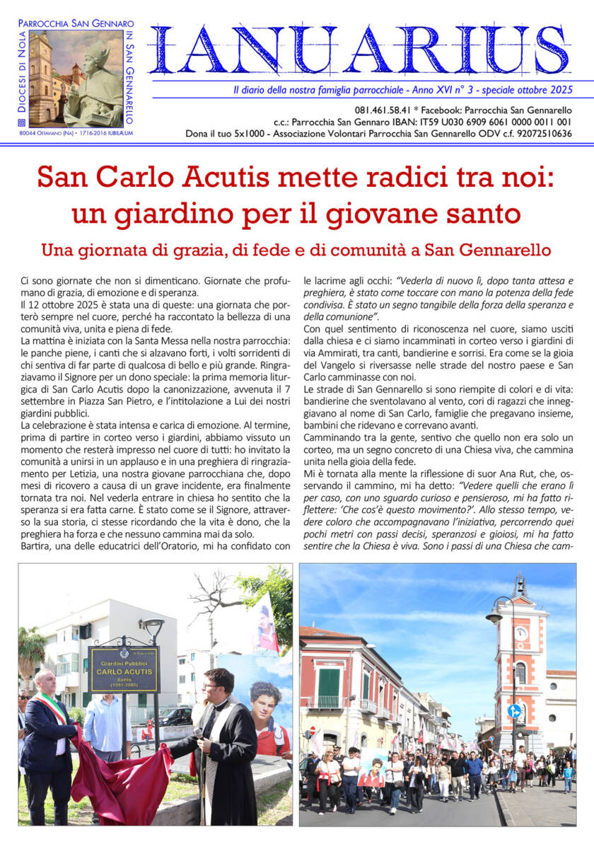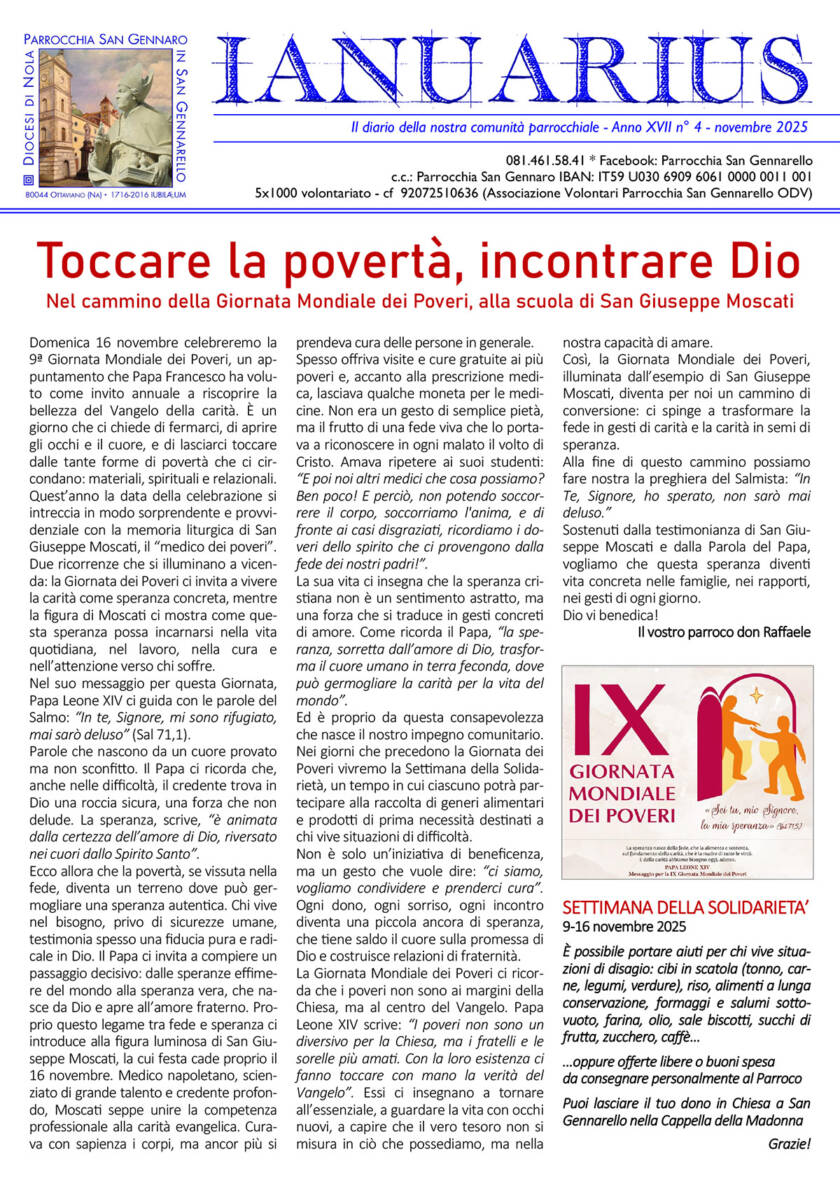 Vi invitiamo caldamente a venire a trovarci in Parrocchia: la porta della nostra Chiesa è sempre aperta per condividere esperienze e per vivere la fede, la speranza e la carità in modo autentico. La nostra comunità vi aspetta con gioia, pronta a camminare insieme, sostenendoci l’uno con l’altro sotto lo sguardo protettivo della Vergine Maria e di San Gennaro, nostro Patrono.