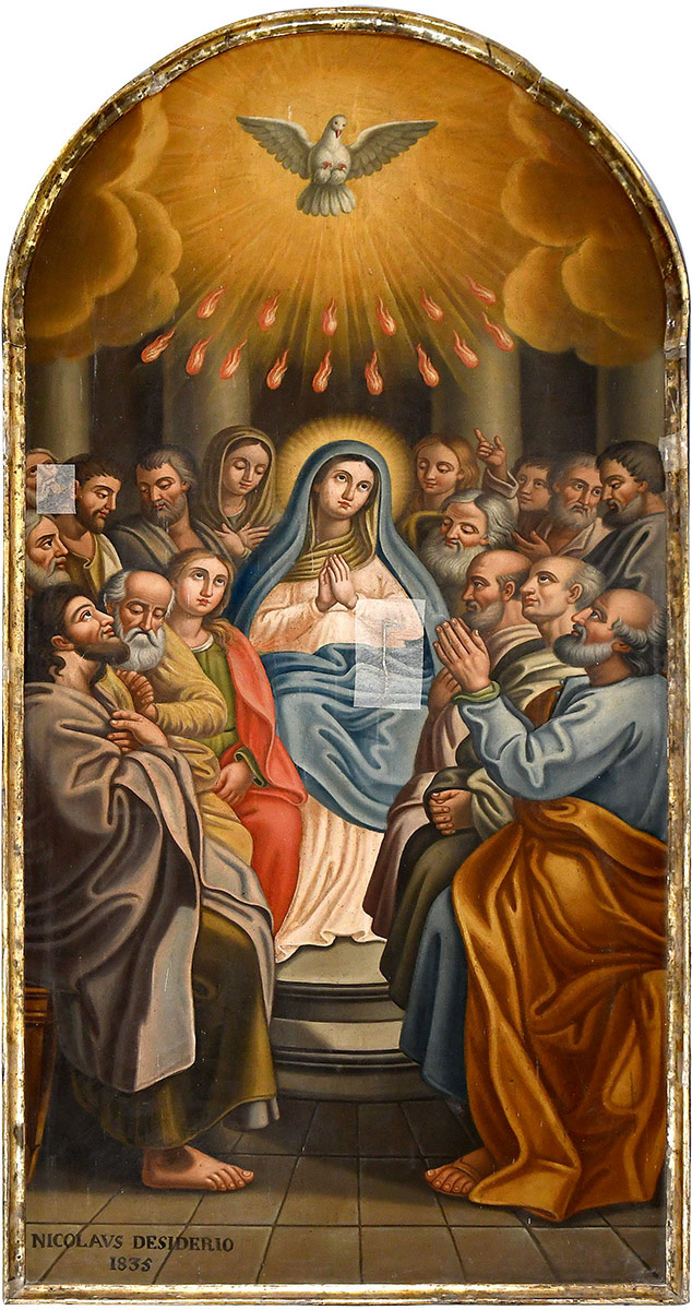 La tela raffigura la Pentecoste, ovvero il momento in cui lo Spirito Santo discende sugli apostoli e sulla Vergine Maria sotto forma di lingue di fuoco, secondo il racconto biblico degli Atti degli Apostoli. Quest’opera, realizzata da Nicola Desiderio nel 1835, si distingue per la sua intensa carica spirituale e per la capacità di trasmettere un profondo senso di sacralità e rivelazione divina.