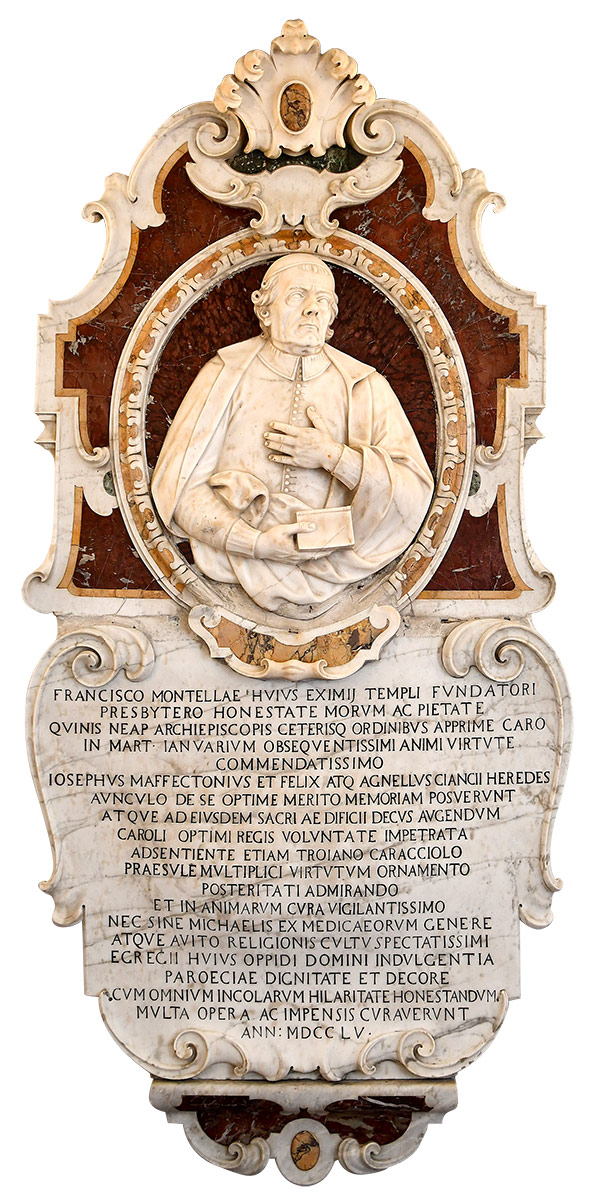 “A Francesco Montella, fondatore di questa splendida Chiesa, sacerdote [che] per la purezza dei costumi e del suo sentimento religioso [era stato] molto caro a cinque arcivescovi di Napoli e [anche] ad altri ordini, molto ragguardevole per la tendenza del suo animo devotissimo al martire [San] Gennaro, Giuseppe Maffettone e Felice e Aniello Cianci, eredi materni, per i suoi vistosi meriti, posero in memoria [questo monumento] e per accrescere il decoro di questo stesso sacro edificio [lo] completarono di ornamenti e, dopo aver ottenuto il permesso dell’ottimo re Carlo, la condiscendenza del vescovo Troiano Caracciolo, attentissimo alla cura della anime e ornato di molteplici virtù che saranno ammirate dai posteri, e la benevolenza del [principe] Michele, signore di questa terra [di Ottajano], discendente della famiglia de’ Medici e di comprovata avita religiosità, lo fecero elevare, con molto lavoro e spesa, a dignità e decoro di Parrocchia, con la gioia di tutti gli abitanti. Anno del Signore 1755.”