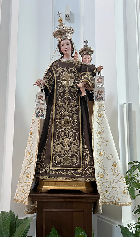 Questa statua di Nostra Signora del Monte Carmelo con il Bambino Gesù benedicente è una splendida espressione dell’arte sacra napoletana, caratterizzata da una raffinata fattura e da un pregiato abito ricamato in oro fino. La Vergine è rappresentata con un manto bianco finemente decorato e una veste marrone, riccamente impreziosita da motivi floreali e arabeschi dorati, elementi che richiamano la tradizione della scuola di ricamo napoletana, fiorente tra il XVII e il XIX secolo e legata alla produzione di paramenti liturgici e vesti per statue devozionali. Sia la Madonna che il Bambino portano sul capo corone preziose, simbolo della loro regalità celeste, e tengono nelle mani lo scapolare, elemento distintivo della devozione carmelitana.