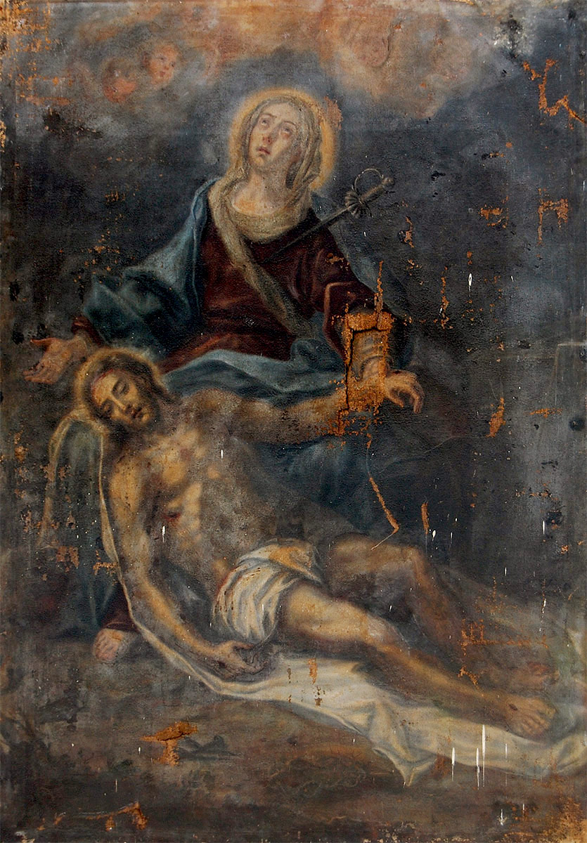 L’opera, sebbene deteriorata, conserva dunque le caratteristiche distintive della pittura napoletana, con la sua capacità di coniugare devozione e teatralità in una rappresentazione toccante della Pietà.