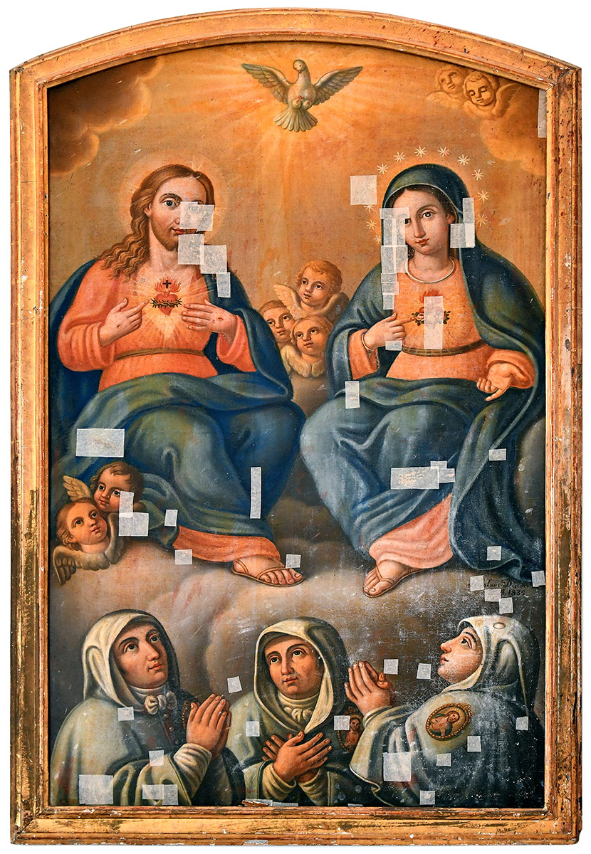 Lo stile segue la tradizione della pittura devozionale ottocentesca, con una composizione simmetrica ed equilibrata. Gesù e Maria hanno pose speculari: entrambi indicano il proprio Cuore Sacro, dal quale si irradia una luce divina. Le loro vesti presentano colori simbolici: il rosso e l’azzurro per Gesù, a simboleggiare la Passione e la divinità, il blu e il rosa per Maria ad evocare purezza e maternità. I confratelli, con i volti rivolti ai Sacri Cuori, mostrano espressioni di intensa devozione, accentuate dal chiaroscuro che dona profondità e realismo ai volti e ai drappeggi.