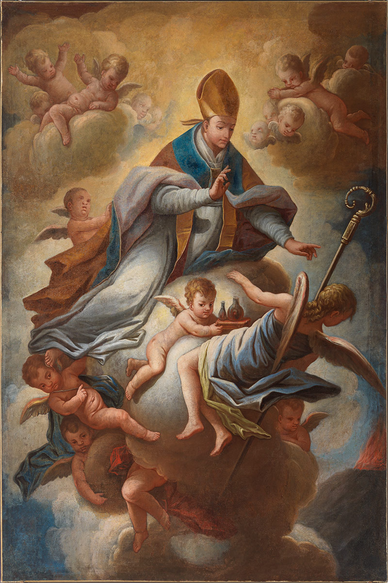 Il dipinto raffigurante la Gloria di san Gennaro vescovo e martire è oggi collocato in una cornice in stucco nell’ultima cappella a destra entrando nella chiesa di San Gennaro nel Comune di San Gennarello. In origine il dipinto costituiva la pala dell’altare maggiore della primiera chiesa edificata nel primo Settecento, come attestato dalla platea di fondazione: “ Un’Altare grande, sopra il quale vi è un quadro grande di S. Gennaro” (Archivio Storico della parrocchia di San Gennarello, Platea e Descrizzione di tutti gli effetti stabili, capitali, annui censi, ed arrendamenti, che possiede la Venerabile Parochiale Chiesa sotto il titolo di S. Gennaro, eretta nella Terra di Ottaiano Diocesi di Nola […], f. 19r).