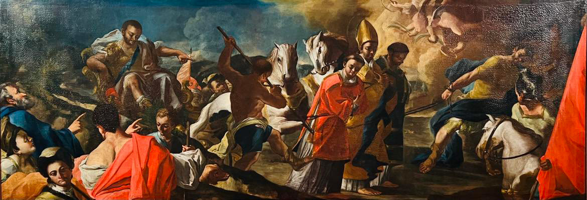 Il sapiente accostamento cromatico, giocato sull’uso dei rossi brillanti e dell’azzurro conferisce luce alla scena mettendo in risalto il movimento concitato dei personaggi e dei panneggi dei carnefici in contrapposizione con la rassegnata pacatezza dei tre martiri.