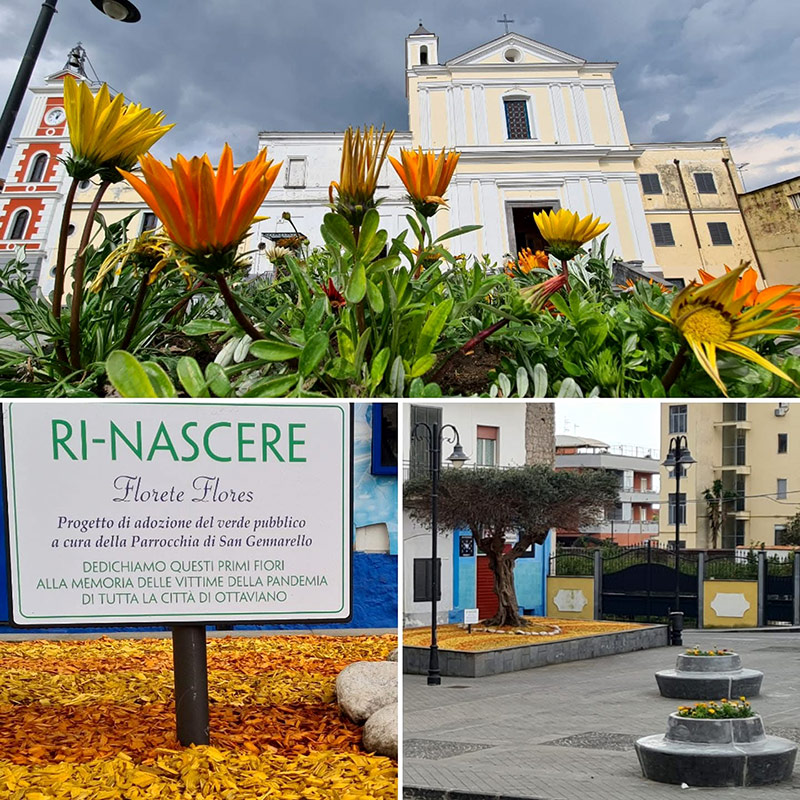 “Florete Flores – Fate sbocciare i fiori” è un progetto di adozione del verde pubblico di Piazza San Gennarello, nato per trasformare il dolore della pandemia in un’opportunità di rinascita e speranza. Avviato ufficialmente il 7 marzo 2021, alla vigilia dell’anniversario del lockdown, il progetto è un atto di memoria collettiva e di impegno civico. Il suo significato simbolico è racchiuso nei primi fiori piantati in Piazza, dedicati alle vittime della pandemia. Ogni fiore rappresenta una storia, un volto, un legame che il tempo non cancella. La memoria diventa così uno stimolo per costruire un futuro migliore, un messaggio di speranza per l’intera comunità.